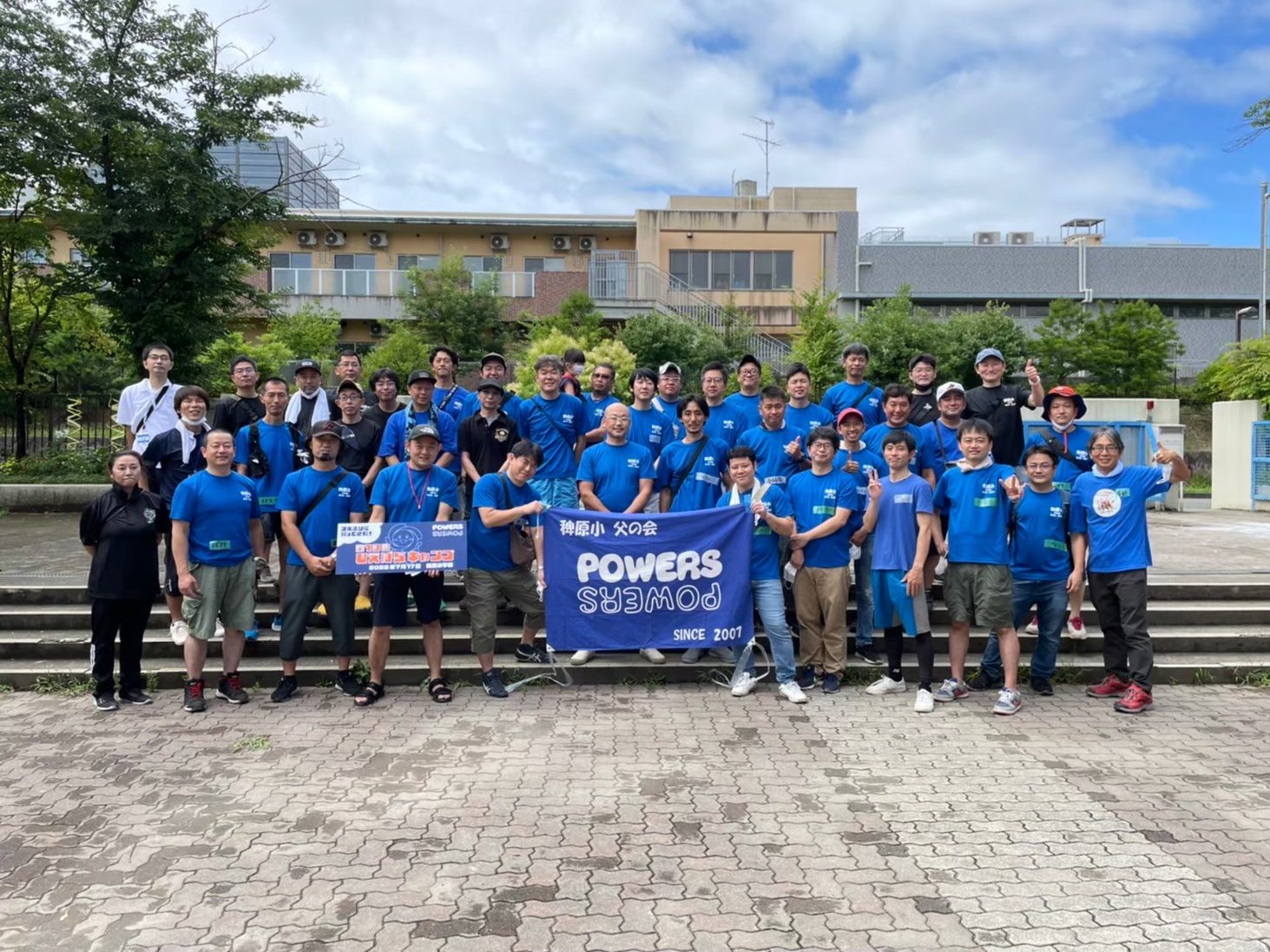 初年度は15名。まずはオヤジの発想で、「POWERS」という会の名称が決められ、POWERSのロゴの入った青いTシャツも作られた。その後は年々青いTシャツの仲間が増えていき、オヤジのひらめきと行動力で「防災キャンプ~学校に泊まろう!」、「星を見る会」、「ペットボトルロケット大会」、「折り紙ヒコーキづくり」、「いじめワークショップ」、「エコカップいかだ下り」といったイベントも随時開催。