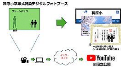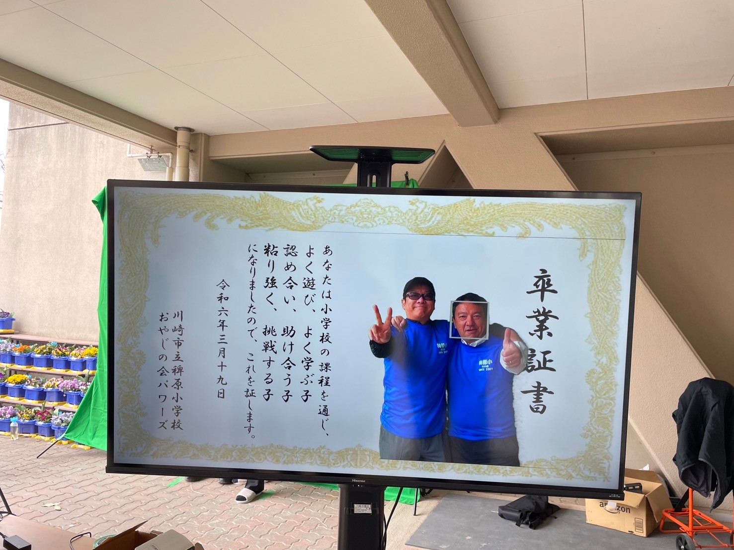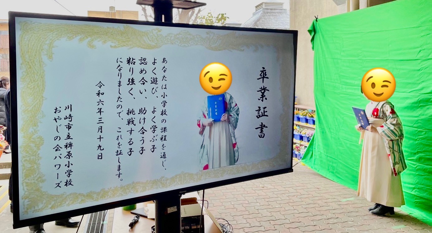 仕組み自体は意外と簡単で、グリーンバックで卒業生を撮影し、巨大卒業式の画像を背景にし映像を合成して、テレビに出力するんです。